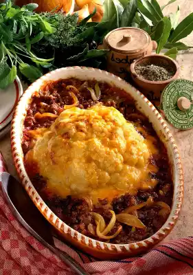 Grate cheese. Pour the sauce into a flat casserole dish. Place the cauliflower in the sauce and sprinkle with cheese. Put butter flakes on the cheese. Bake in a preheated oven (electric: 200 °C/ gas: level 3) for 30-35 minutes.