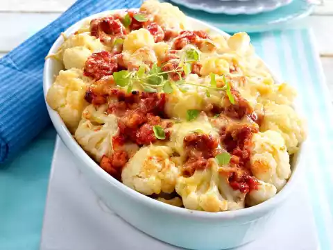 Cut the potatoes into slices and fill them into a greased casserole dish. Put cauliflower florets on the edge and turkey bolognese in the middle. Grate the cheese and sprinkle over it. In a preheated oven (electric cooker: 200 °C/circulating air: 175 °C/gas: level 3) approx.