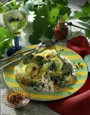 Cut the mushrooms in half. Fry in hot fat. Sprinkle with curry and sauté. Add stock and milk while stirring, bring to the boil, thicken. Season to taste with salt, pepper and lemon juice. Drain rice if necessary, arrange everything