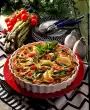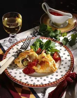 Add to the cream cheese mixture together with the vegetables and mix well. Roll out the puff pastry and cut into quarters. Place 1-2 tablespoons of the vegetable mixture in the middle of each pastry quarter. Separate the egg. Brush the edges of the dough with egg white and beat over the vegetable filling to form small packets. Press the edges of the dough well together. Mix egg yolk and cream and spread on the puff pastry packages. Bake in the preheated oven (electric cooker: 200 °C/ gas: level 3) for approx. 30 minutes. In the meantime, peel and finely chop the onion and garlic. Heat the oil in a pot and fry the onion and garlic cubes over medium heat until translucent. Add the tomatoes, chop them with a wooden spoon and let them boil down for about 10 minutes, stirring occasionally.