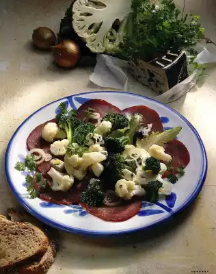 Clean the cauliflower and broccoli, cut into florets and wash. Cook the cauliflower florets in plenty of boiling salted water for 8-10 minutes. Add broccoli halfway through the cooking time. In the meantime peel onions and cut them into fine rings.