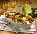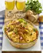 Arrange the cauliflower and potatoes in an ovenproof dish. Pour the minced sauce over it. Sprinkle with cheese. Bake in a preheated oven (electric cooker: 200 °C/ convection oven: 175 °C/ gas: level 3) for approx. 15 minutes. Sprinkle with carrot shavings and garnish with basil