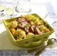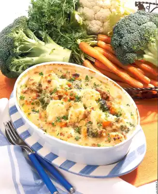 Refine with cream. Melt half of the cheese in it. Season to taste with salt, pepper and nutmeg. Fill vegetables and minced meat into an ovenproof dish. Pour sauce over it. Sprinkle with remaining cheese. Bake in a preheated oven (electric cooker: 200 °C/ gas: level 3) for about 20 minutes. Serve sprinkled with parsley