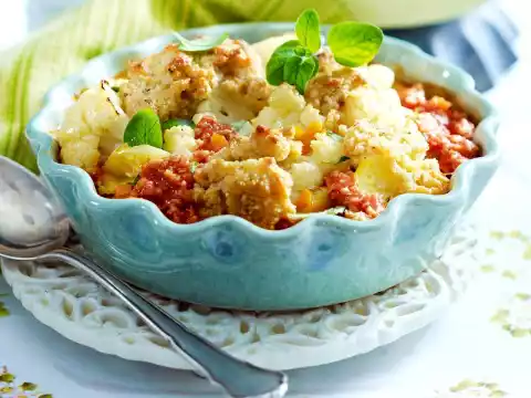 Remove 6 tablespoons of soy cream for the crust. Grease 4 small ovenproof moulds or one large mould. Layer some bolognese, potatoes, vegetables and the rest of the soy cream. Repeat the process, finish with vegetables.