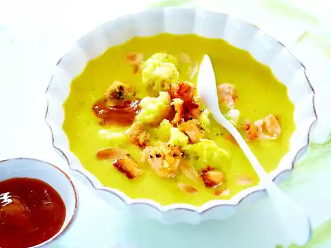 Approx. 1⁄4 of the cauliflower florets with a skimmer and set aside. Puree the soup with a hand blender. Stir yoghurt and starch until smooth and add to the soup while stirring. Bring to the boil again and simmer for about 3 minutes.