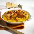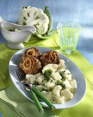 Add herbs to the cauliflower. Arrange the cauliflower with béchamel sauce and meatballs on a plate. Garnish the cauliflower with the remaining parsley and the meatballs with the onion rings.