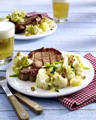 Mix cauliflower, leek, pineapple and curry sauce. Fold in the peanuts, except for something to sprinkle. Let the salad stand for about 1 hour. Wash parsley, shake dry and chop. Grill the smoked pork on a preheated grill, turning, for 8-10 minutes and season with pepper (or fry in a pan in a little oil for 6-8 minutes). Add parsley to the salad, except for a little bit for sprinkling. If necessary, season again with salt, pepper and pineapple juice and sprinkle with remaining peanuts and parsley.