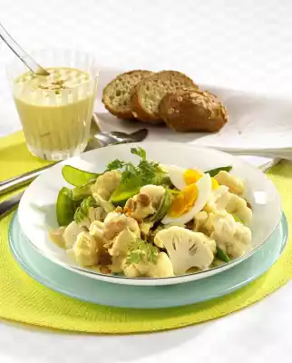 Boil the eggs in boiling water for about 7 minutes, rinse with cold water. Clean the cauliflower, divide into small florets and wash. Wash and clean mangetouts. Blanch both in boiling salted water for 1-2 minutes.