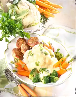 Drain the carrots and broccoli. Remove the cauliflower from the cooking water. Measure 300 ml vegetable water. Heat the fat in a saucepan. Dust with flour and let it sweat on. While stirring, deglaze with vegetable water and milk and bring to the boil. Simmer at low heat for about 5 minutes while stirring. Remove sauce from the stove. Mix the egg yolks and 3-4 tablespoons of sauce and stir into the sauce. Season to taste with salt, sugar, nutmeg and lemon juice. Arrange vegetables and meatballs on a plate. Spread the sauce over the vegetables and serve sprinkled with chervil as desired