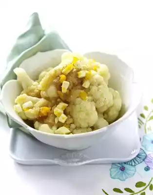 Clean the cauliflower, wash it and cut it into small florets. Cook the cauliflower in boiling salted water for about 10 minutes, drain. Cook the eggs in boiling water for about 8 minutes, take them out and quench them in cold water