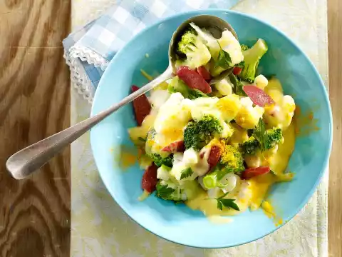 Heat the vegetables in the sauce. Cut mini salami into thin slices. Arrange vegetables in bowls, sprinkle with slices of salami and curry powder and garnish with parsley if desired. Baguette tastes good with it.