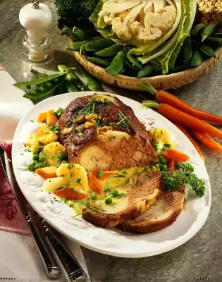 Add herbs to the sauce and season with salt and pepper. Add the carrots, peas and remaining cauliflower to the hot sauce and warm up briefly. Arrange meatloaf and vegetables on a plate. Serve garnished with parsley and chives. Boiled potatoes taste good with it