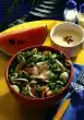 Coarsely chop the peanuts. Cut the eggs into slices. Mix cauliflower, mangetouts and peanut sauce. Sprinkle peanuts over it. Arrange ice crevices on top and garnish