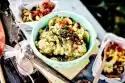 Clean and wash the cauliflower, drain well and grate roughly (see tip on the right). Cook frozen peas in boiling salted water for about 2 minutes. After about 1 minute add cauliflower and cook along. Pour the vegetables into a sieve, quench, drain and allow to cool. Lightly roast the pumpkin seeds in a pan without fat. Take them out and let them cool down. Sort the salad, wash and drain.