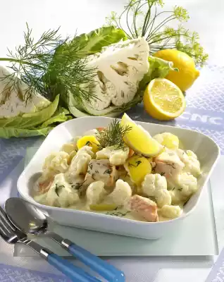 Let simmer for about 5 minutes. Season the sauce with salt, pepper, sugar and 1 tablespoon lemon juice. Drain potatoes and cauliflower and add to the sauce. Fold in the salmon carefully. Wash the dill, dab dry, chop finely and sprinkle over the cauliflower and salmon ragout. Pour the ragout into a bowl. Garnish with lemon and dill