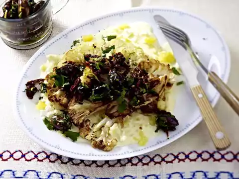 Cover and simmer for about 15 minutes. Grate the parmesan. Coarsely mash the potato mixture. Stir in cheese and crème fraîche. Season sauce with salt and pepper. Serve with cauliflower steaks and relish.