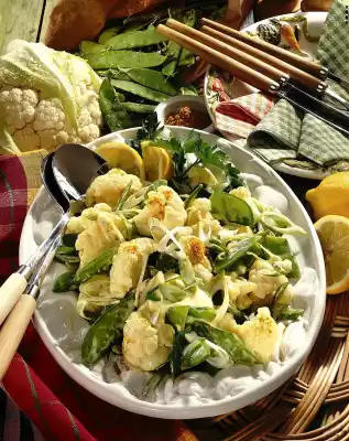 Clean, wash and cut the cauliflower into florets. Clean and wash the mangetouts and possibly cut them in half at an angle. Cook cauliflower in little boiling salted water for 6-8 minutes. After 4-6 minutes, add mangetouts and cook with the cauliflower.