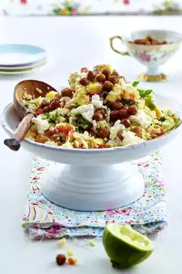 Mix the cauliflower, peppers, peaches and herbs with the lime vinaigrette. Mix in the feta and about 2/3 of the chickpeas. Season to taste with curry, salt and pepper. Arrange in a deep dish and sprinkle with the remaining chickpeas.