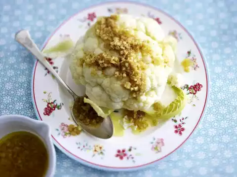Clean the cauliflower, cut out the hard stalk so that the head does not fall apart, and wash. In a large pot, boil up plenty of salted water with milk and 2 tablespoons of lemon juice.