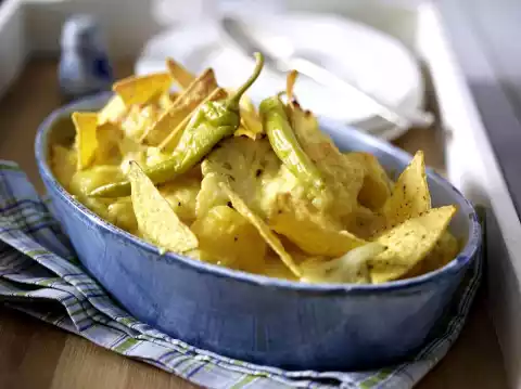 Grease a casserole dish. Put potatoes and cauliflower in the dish. Pour the sauce over them. Sprinkle with the remaining cheese and bake in a hot oven for about 30 minutes. Distribute the chips and peppers on the casserole dish about 5 minutes before the end of the baking time.
