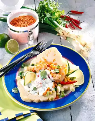Heat the oil in a pan. Brown the meat in it while turning. Fry spring onions and chilli for about 3 minutes. Add the lentils. Season to taste with salt, pepper and 1 tsp. lemon juice. Arrange cauliflower with lentils and yoghurt sauce