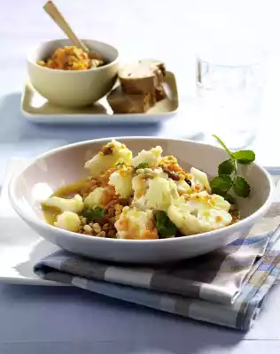 Mix raisins and pine nuts under the lentils. Add vinegar and oil. Season to taste with salt, pepper and coriander. Pour marinade over the cauliflower and arrange lukewarm on plates. Garnish with coriander.