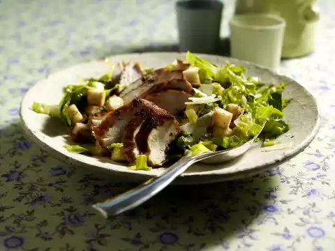 Stir in onion, garlic and anchovies. Add stock and stir until smooth. Grate parmesan. Clean, wash, spin dry and cut into strips. Parmesan, crôutons. Mix salad and dressing, cut meat into slices. Arrange salad and meat on a plate