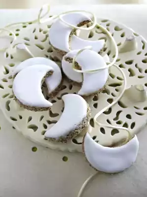 Sprinkle sugar on the work surface. Roll out the dough about 1 cm thick. Spread the dough thinly with reclaimed egg white mass, cut out moons with a round cookie cutter (approx. 5 cm Ø), dipping the cookie cutter repeatedly in water.