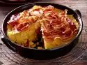 Die Zwiebel schälen und in feine Scheiben schneiden. Das Öl in einer Pfanne erhitzen und die Zwiebel vorsichtig weich kochen. Zum Abkühlen auf eine Seite stellen. Die Kartoffeln schälen und in dünne Scheiben schneiden und den Speck hacken. Den gehackten Speck mit den abgekühlten Zwiebeln mischen, dann mit dem Esslöffel des einfachen Mehls bestreuen und zum Mischen schwenken. Den Sellerie schälen und grob reiben. Kartoffeln, Sellerie und Speck in eine 20 cm tiefe Pastetenform schichten. Wiederholen Sie das Ganze, bis alle Zutaten aufgebraucht sind, wobei Sie mit einer Schicht Kartoffeln beginnen und enden. Apfelwein und Senf mischen und dann über die Schichten gießen.