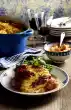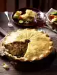 Rollen Sie den Teig aus, bis er etwas größer als die Tortenform ist, und schneiden Sie vom Rand einen Streifen Teig ab. Die Ränder der Tortenplatte mit etwas geschlagenem Ei bestreichen und den Teig fixieren und mit etwas mehr geschlagenem Ei bestreichen. Dann rollen Sie den Teig bei Bedarf etwas mehr ein und drapieren ihn über die Schale. Schneiden Sie den überschüssigen Teig ab und drücken Sie die Ränder zum Versiegeln zusammen. Schneiden Sie in der Mitte des Teigs ein Loch in den Teig, damit der Dampf entweichen kann. Mit dem restlichen geschlagenen Ei bestreichen, um es zu glasieren. Im vorgeheizten Backofen bei 190°C/Gasmarke 5 45 Minuten bis zu einer Stunde backen, bis der Teig goldfarben und durchgegart ist. Wenn der Teig zu stark zu bräunen beginnt, die Oberseite mit Folie abdecken. Vor dem Servieren mit grünem Gemüse 5 Minuten abkühlen lassen.