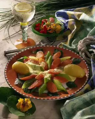 Wash potatoes thoroughly and cook in boiling salted water for about 18 minutes. Clean and wash the carrots and cut them into diagonal slices. Clean, wash and cut the celery into pieces.