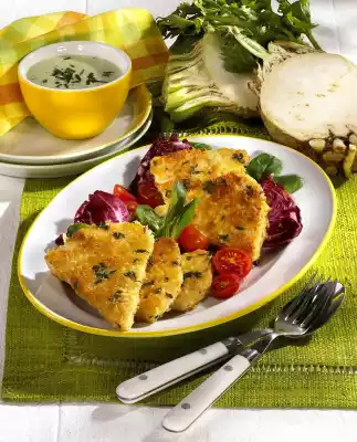 Season to taste with salt and pepper. Clean and peel the celeriac, rinse it once if necessary and dab it dry. Cut the celery into slices about 5 mm thick. Cut these into 2 triangles each. Mix breadcrumbs and parmesan.