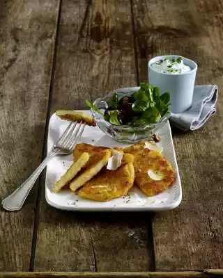 Keep ready cutlets warm. Whisk the dressing again and mix with the salad. Arrange cutlets and salad on plates and sprinkle with parmesan slices. Sprinkle the remaining herbs on the quark and add.