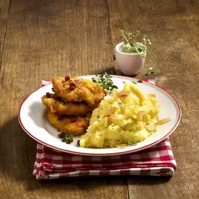 Heat the oil in a large pan and fry the escalopes on both sides for 3-4 minutes at medium heat. In the meantime heat milk and 25 g fat. Drain the potato-celery, add the milk and mash with a potato masher. Foam 15 g fat in a small saucepan. Arrange celery-potato puree and schnitzel on plates. Sprinkle the puree with almonds and drizzle with fat. Garnish schnitzel with cranberries and thyme