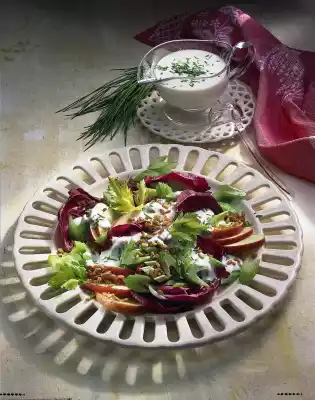Clean the radicchio, remove the leaves, wash and drain. Wash apples, dab dry, quarter and cut out the core. Cut apple quarters into thin slices and sprinkle with lemon juice.