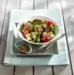 Clean and wash the romaine lettuce, cut off 8 leaves in whole. Cut remaining lettuce into strips. Clean, wash and chop the peppers. For the vinaigrette, mix lemon juice, vinegar, Worcester sauce, salt, sugar and pepper.