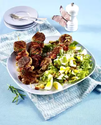 In the meantime, clean and wash the lettuce, spin-dry it and pluck it roughly. Peel the eggs and cut into slices. Arrange salad with skewers on a plate, drizzle with dressing. Break the remaining Parmesan cheese into fine pieces and spread on the salad with potatoes, eggs and almonds.