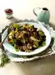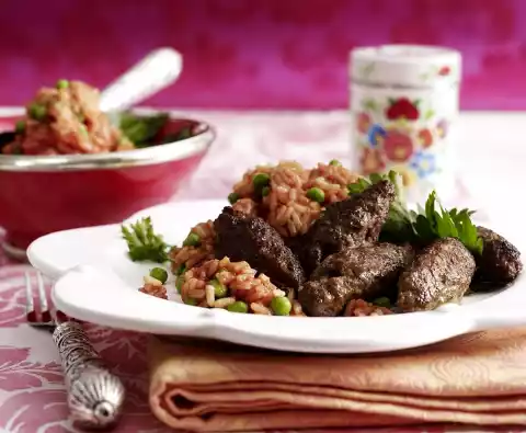 Add the rest of the garlic and frozen peas to the rice and continue cooking for 2-3 minutes. Season with salt, pepper and sugar. Arrange everything.