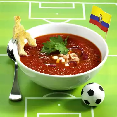 Meanwhile peel the onion, cut it into rings and add it to the hot soup. Add crabs and stir carefully. Season with lemon juice and coarse pepper. Chill the soup. Garnish with parsley.