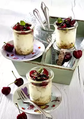 Add the cherries and simmer for about 5 minutes at low heat while stirring. Leave to cool slightly. Wash mint, dab dry, pluck off leaves and chop coarsely, except for something for decoration.