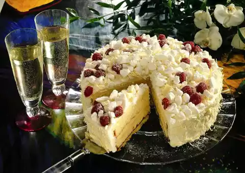 Sprinkle the edge with some chocolate shavings. Spread meringue dome-shaped on the cake. Sprinkle remaining shavings in between and decorate with raspberries. Dust with icing sugar before serving. Makes about 16 pieces.
