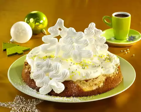 While continuing to beat, add 150 g sugar. Keep beating until the sugar is completely dissolved. Pour approx. 3 tablespoons into a piping bag with a small star-shaped spout and spray Christmas trees onto a baking tray lined with baking paper. Spread the rest of the meringue loosely on the sponge mixture, leaving about 1 cm of sponge rim free. Bake in the preheated oven (electric cooker: 175 °C/ convection oven: 150 °C/ gas: level 2) for approx. 35 minutes. Take out and let cool down. Dry fir trees in the oven at 50 °C for approx. 2 hours. Soak gelatine in cold water. Whip the cream until stiff, adding 75 g sugar. Squeeze the gelatine. Warm 3 tablespoons of sparkling wine lukewarm, dissolve gelatine in it. Stir the rest of the champagne into the mixture.