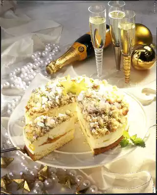 Carefully stir the gelatinizing juice into the champagne sour cream mixture in streaks. Pour the mixture dome-shaped onto the bottom cake base. Sprinkle with the dough crumbs. Put the cake in a cool place for about 4 hours.