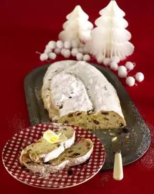 Cover and leave to rise in a warm place for about 30 minutes. Knead the dough well again. Roll out the dough piece to a longish, oval flat cake. Fold over approx. 1/3 of the long side to the middle, fold over the other long side and form into stollen with the edge of your hand. Place on a baking tray lined with baking paper. Leave to rise again for another 20 minutes. Bake the stollen in a preheated oven (electric cooker: 200 °C/ convection oven: 175 °C/ gas: level 3) for approx. 12 minutes. Then switch the oven down (electric oven: 175 °C/ convection oven: 150 °C/ gas: level 2) and bake for another 30-40 minutes. Remove the stollen from the oven. Melt 100 g butter and immediately coat the stollen with a third of it, dust with icing sugar. Repeat the process until the melted butter and icing sugar is used up