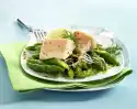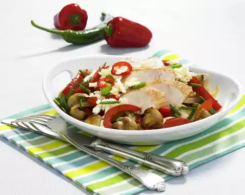 Season with salt and pepper. Wash the chives and cut into small rolls. Add flesich to the vegetables, heat and season with salt, pepper and paprika. Cut the chicken filet into slices. Put the vegetables on a plate and arrange the chicken filet on it.
