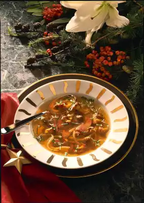 Bring the stock with the pasta and chanterelles to the boil, season with salt and pepper. Wash parsley and cut into thin strips. Divide meat slices on 4 plates, pour hot soup over them and sprinkle with parsley.