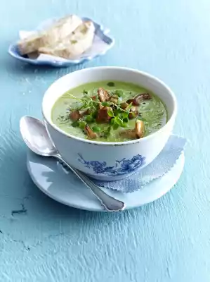Take peas out of the soup as a garnish at will. Finely puree the soup. Stir in cream. Season to taste with salt, pepper and nutmeg, bring to the boil briefly. Stir in thyme leaves and arrange in bowls.