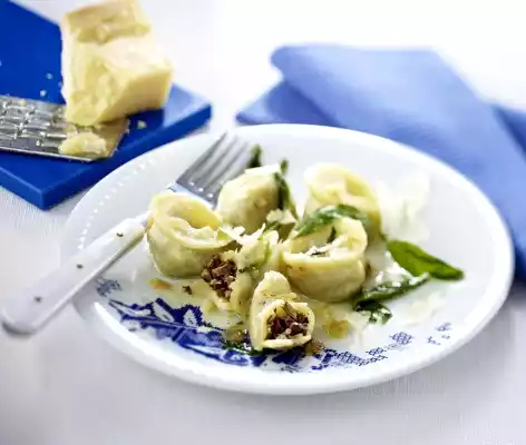 Squeeze the garlic out of its skin and crush it slightly with a fork. Wash the sage and remove the leaves. Heat half the butter in a frying pan. Sauté half the garlic and half the sage in it. Fry half of the pelmenis.