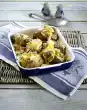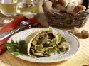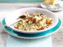 Heat 30 g fat in a frying pan and fry the chanterelles for approx. 5 minutes while turning. Finally, add green spring onion pieces, except for a little bit for sprinkling, and fry briefly. Season the chanterelles with salt and pepper and set aside.