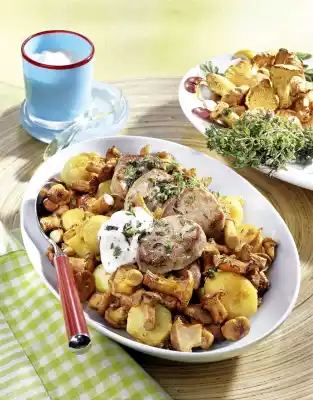 Wash potatoes thoroughly and boil in water for about 20 minutes. Clean and sanitise the chanterelles, wash them briefly if necessary and pat them dry. Quench the potatoes, peel them and cut them into halves or quarters depending on size